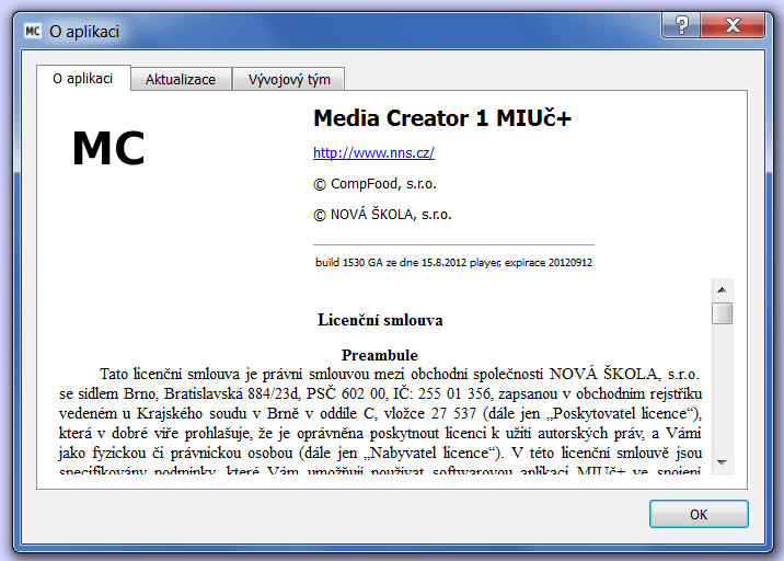 Menu dále obsahuje položku "O aplikaci", která zobrazí dialog s podrobnějšími informacemi o programu Media Creator. Tento dialog lze vyvolat také kliknutím na logo MC v hlavním panelu.